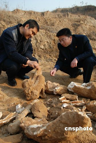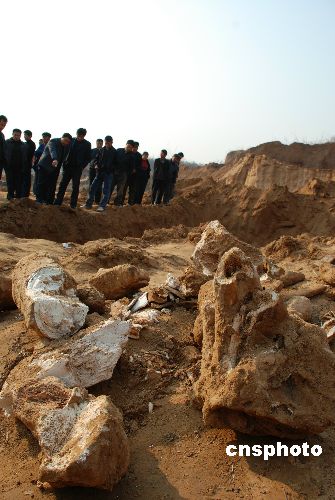 12月5日,山東淄博周村區(qū)王村鎮(zhèn)西道村磚廠挖掘出疑似“恐龍”的巨型動(dòng)物骨骼化石。當(dāng)日10點(diǎn)48分,正在淄博周村區(qū)王村鎮(zhèn)西道村磚廠施工的司機(jī)小郝,給村主任劉道新打電話說(shuō)“挖掘機(jī)在工作時(shí)挖到了大量的化石,很像是動(dòng)物的骨骼。”在現(xiàn)場(chǎng)進(jìn)行保護(hù)的彭陽(yáng)派出所的所長(zhǎng)于成杰介紹說(shuō),這次挖到的化石很大,露出來(lái)的化石有6米多長(zhǎng),呈圓柱狀細(xì)端的直徑有18-19厘米,粗端的直徑有30-40厘米。其動(dòng)物骨格的特征非常明顯,其體積顯然比大象要大的多,與史前動(dòng)物“恐龍”骨骼化石極其相似。中新社發(fā) 梁寶海 攝