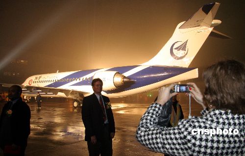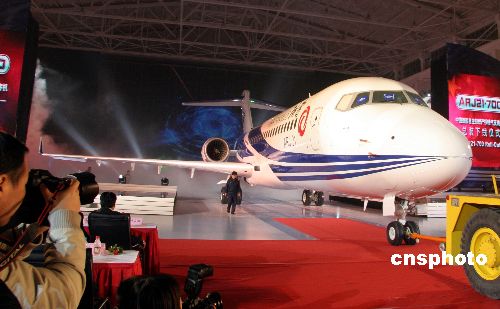 十二月二十一日下午,由中國(guó)航空工業(yè)第一集團(tuán)公司(中國(guó)一航)自行研制生產(chǎn)的中國(guó)首架自主知識(shí)產(chǎn)權(quán)噴氣支線客機(jī)ARJ21-700飛機(jī),在上海飛機(jī)制造廠順利實(shí)現(xiàn)總裝下線。此舉表明,中國(guó)在民用飛機(jī)科研和制造領(lǐng)域取得突破性進(jìn)展,中國(guó)自主研制的先進(jìn)噴氣支線客機(jī)已成為世界民用客機(jī)大家庭的新成員。中新社發(fā) 孫自法 攝