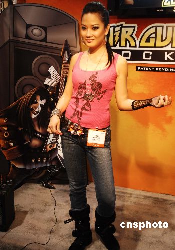 一月九日,一位亞裔樂(lè)手在美國(guó)拉斯維加斯舉辦的世界最大消費(fèi)電子產(chǎn)品展上,表現(xiàn)數(shù)字隱形電吉它的奇妙之處,她只需模擬常規(guī)動(dòng)作就會(huì)奏出動(dòng)聽的電子樂(lè)。中新社發(fā) 賈國(guó)榮 攝