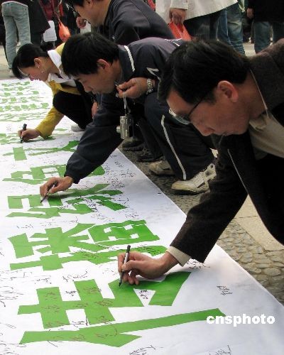 圖:北京大學(xué)生參加綠色奧運(yùn)簽名活動(dòng)