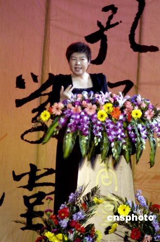 2008年4月5日晚,著名學(xué)者、北京師范大學(xué)教授于丹來到山東曲阜,作為剛剛開設(shè)的“孔子學(xué)堂”首位主講人登上杏壇的講臺!翱鬃訉W(xué)堂”是曲阜市與中華書局面向廣大普通游客和公眾開設(shè)的文化大型講座。今后每年的4月到10月,每月都將邀請一名專家主講,一名專家現(xiàn)場點評,通過和聽眾的問答互動,旨在弘揚儒學(xué)經(jīng)典文化。中新社發(fā) 張侃 攝
