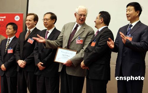 四月九日,全球500強、世界領(lǐng)先的多元化高科技制造企業(yè)霍尼韋爾公司攜手北京航空航天大學(xué),共同拉開2008年霍尼韋爾—諾貝爾全球校園行的序幕。諾貝爾物理獎獲得者謝爾登·格拉肖博士(右三)親臨現(xiàn)場為學(xué)子們講授了他的學(xué)術(shù)成果和科研心得,與學(xué)生們進行了面對面的交流;裟犴f爾—諾貝爾全球校園行活動由霍尼韋爾公司發(fā)起,旨在全球范圍內(nèi)提升高?茖W(xué)教育、培養(yǎng)高素質(zhì)科技創(chuàng)新人才的社會公益活動。中新社發(fā) 任海霞 攝