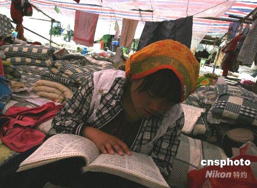 一位四川茂縣地震災(zāi)區(qū)的女學(xué)生抓緊白天時光學(xué)習(xí)功課。汶川大地震造成茂縣災(zāi)區(qū)至今電力完全中斷,道路危險艱難,該縣民族中學(xué)全成危房,600多名學(xué)生在廣場簡易帳篷里學(xué)習(xí)生活。中新社發(fā) 賈國榮 攝