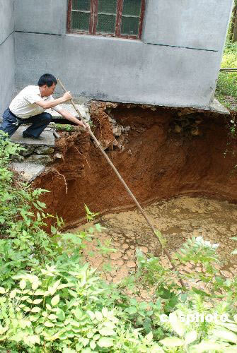 6月5日凌晨,江西省上饒市玉山縣一農(nóng)家屋角發(fā)生一起面積約三十平方米、深約六七米的地陷事件,工作人員正在探測(cè)地陷深度。此前,5月12日,四川汶川地震發(fā)生后半小時(shí),江西萍鄉(xiāng)市蘆溪縣一農(nóng)田也曾發(fā)生兩千平方米的地陷事件。當(dāng)日幾乎同時(shí),該市上栗縣也發(fā)生一起農(nóng)田大面積沉陷事件。專(zhuān)家初步分析,上述三起地陷主要是由當(dāng)?shù)氐刭|(zhì)結(jié)構(gòu)引起的,與四川地震無(wú)關(guān)。中新社發(fā) 劉樹(shù)楨 攝