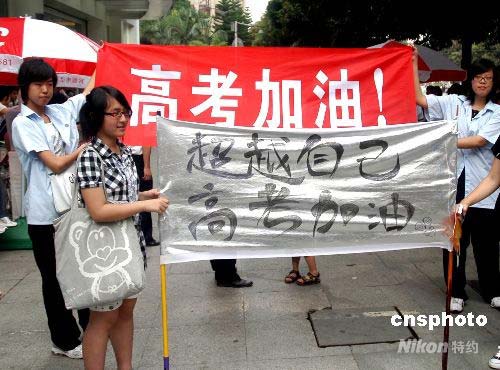 2008年6月7日,福州三中考點(diǎn),該校高一的學(xué)弟學(xué)妹們拉起“超越自己,高考加油”的橫幅為參加考試的學(xué)長們加油,同時(shí)也親身體驗(yàn)一下高考的緊張氛圍。中新社發(fā) 張 斌 攝