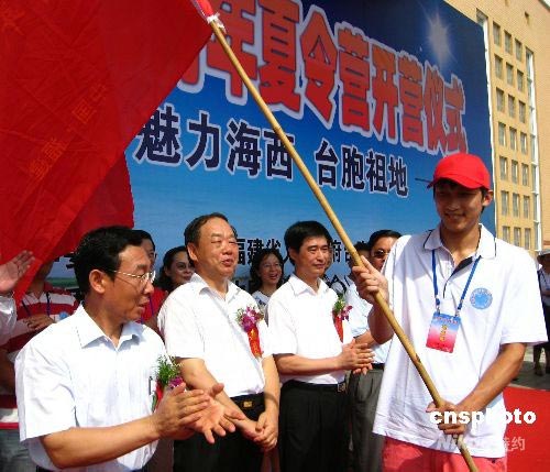 7月3日,海峽西岸2008年臺胞青年夏令營在福州開營,福建省委常委、宣傳部長唐國忠(左一)為夏令營授旗。作為全國臺聯(lián)臺胞青年千人夏令營的福建分營,本次夏令營為期6天,吸引110多名臺胞青年參加。中新社發(fā) 林維莉 攝