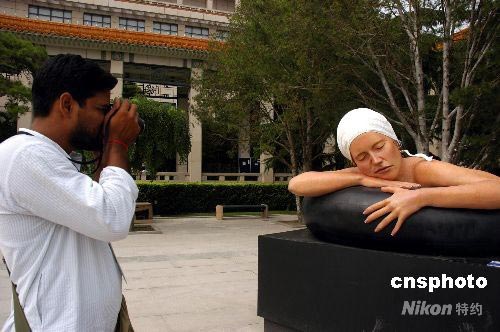 7月8日,“2008·第三屆中國(guó)北京國(guó)際美術(shù)雙年展”在北京美術(shù)館舉行,吸引不少外國(guó)游客到來(lái)。此次展覽有來(lái)自81個(gè)國(guó)家的747件當(dāng)代繪畫和雕塑作品共同展出,展覽將持續(xù)到8月12日。圖為展廳外的參展“模特”栩栩如生,讓人難辨真假。中新社發(fā) 張雙雙 攝