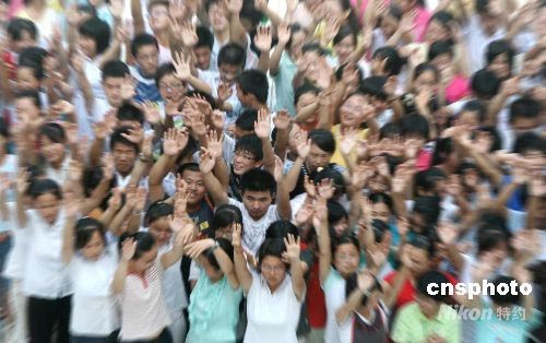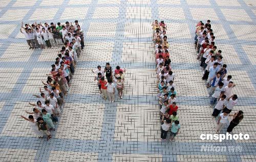 2008年7月11日是“世界人口日”,安徽省含山縣含山中學(xué)200余名中學(xué)生在老師的組織下以行為藝術(shù)的形式表演“擁擠的地球”,并組成“7·11”圖案,以此呼吁人們重視人口問(wèn)題,并關(guān)注人口與資源、環(huán)境等關(guān)系,紀(jì)念第19個(gè)“世界人口日”。中新社發(fā) 程千俊 攝