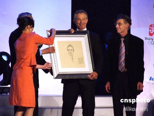 8月4日,由北京大學(xué)主辦的“2008奧運(yùn).冠軍論壇”在北京大學(xué)百年紀(jì)念講堂內(nèi)隆重開幕。出席開幕盛典的貴賓有英國(guó)前首相托尼.布萊爾、成龍、譚盾、揚(yáng)揚(yáng)、羅雪娟在內(nèi)的數(shù)十位中外嘉賓。圖為北京大學(xué)校長(zhǎng)許智宏向英國(guó)前首相托尼.布萊爾贈(zèng)送畫像。中新社發(fā) 鄭雄增 攝