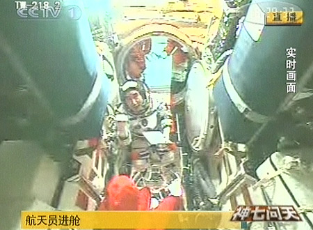 25日18時(shí)25分許,神舟七號(hào)三名航天員陸續(xù)進(jìn)艙。第一名進(jìn)艙的是景海鵬,第二名進(jìn)艙的是劉伯明,最后,指令長(zhǎng)翟志剛也開始進(jìn)入。