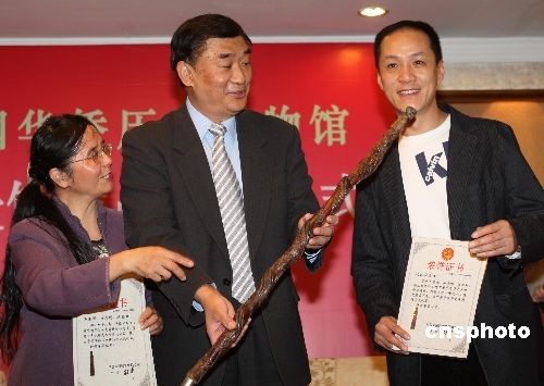 著名演員馮遠(yuǎn)征(右)在北京華僑飯店向中國華僑歷史博物館捐贈百年木雕龍人頭拐杖,中國僑聯(lián)副主席李祖沛(中)接受捐贈藏品。