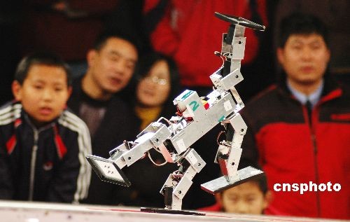 12月20日,“2008中國(guó)機(jī)器人大賽活動(dòng)在蘇州木瀆科技創(chuàng)業(yè)園舉行,來自全國(guó)各款頂級(jí)版智能機(jī)器人紛紛走臺(tái)亮相。這些機(jī)器人可以完成走路、翻滾、伏地挺身及單腿平衡等接近于人體活動(dòng)的各種動(dòng)作,吸引了數(shù)百名機(jī)器人愛好者前來觀戰(zhàn)。中新社發(fā) 朱子寒 攝
