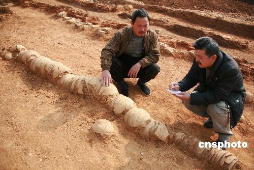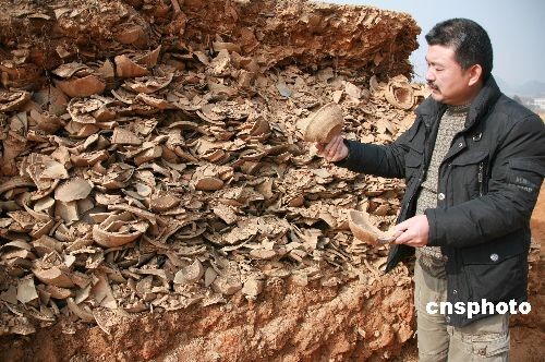 2008年12月20日,歙縣北宋龍窯遺址發(fā)掘現(xiàn)場。近日,安徽歙縣桂林鎮(zhèn)發(fā)現(xiàn)一處北宋龍窯遺址,面積達3700多平方米,出土了大量精美青瓷珍貴文物。經安徽省考古專家勘察鑒定為北宋時的龍窯,主要生產陶器和青瓷,專家分析至少有上千件珍稀文物。該處北宋龍窯遺址于2008年9月開挖績黃高速公路3標段連接線時發(fā)現(xiàn)。中新社發(fā) 方也廣德 攝