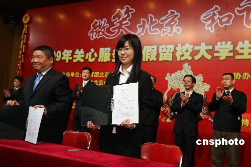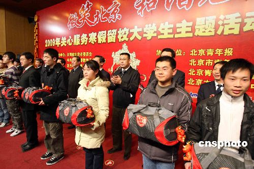 一月十日,北京啟動“微笑北京 和諧社會”關心服務寒假留校大學生主題活動,其主要內(nèi)容包括關心地震災區(qū)、邊遠地區(qū)和經(jīng)濟困難大學生,提供見習崗位,幫助同學們利用寒假進行就業(yè)創(chuàng)業(yè)見習。為留校學生贈送兩千個愛心大禮包。中新社發(fā) 任海霞 攝
