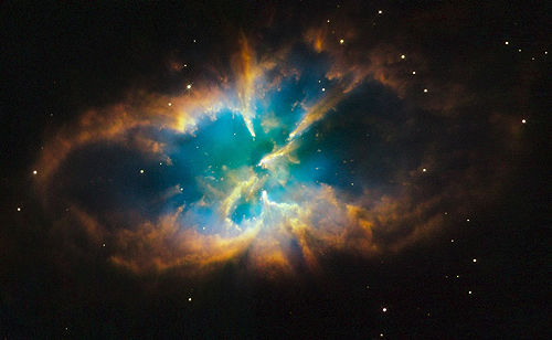 據(jù)美國(guó)每日太空網(wǎng)報(bào)道,哈勃太空望遠(yuǎn)鏡日前拍攝到銀河系內(nèi)一個(gè)罕見的美麗行星狀星云NGC2818,它隱藏在一個(gè)距離地球1萬光年羅盤星座的恒星團(tuán)內(nèi)部。這張精美的圖片是由哈勃太空望遠(yuǎn)鏡廣角行星2號(hào)相機(jī)于2008年11月份拍攝的,其彩色部分分別代表著該星云的噴射釋放物質(zhì),它們共同組成細(xì)絲狀漩渦結(jié)構(gòu),其中紅色部分代表氮?dú)、綠色部分代表氫氣、藍(lán)色部分代表氧氣。