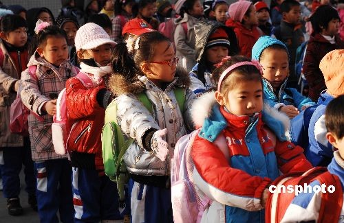 3月2日早,大連鵬輝小學(xué)的學(xué)生們?cè)诓賵?chǎng)列隊(duì)。當(dāng)日,寒假過(guò)后,遼寧大連市中小學(xué)2008-2009學(xué)年度第二學(xué)期開學(xué)上課。中新社發(fā) 劉德斌 攝