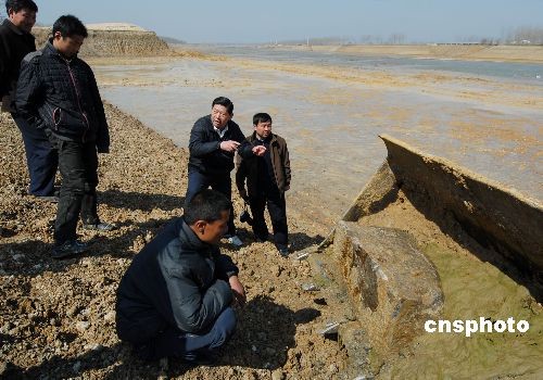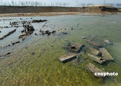2009年3月25日,在京杭運河山東臺兒莊段拍攝到的浮出水面的明朝古運河船閘閘址。近日,一座在水下沉睡了400多年的古水工建筑遺址(古船閘)在京杭運河臺兒莊段進行河道疏浚工程時被發(fā)現(xiàn),這座古船閘位于新閘村北古運河中心,船閘東西長約56米,南北約12米,古船閘的木樁繁多,條狀塊石可見,閘門樁基遺址清晰,據(jù)考證船閘修建于明朝萬歷年間,是明代泇運河上的丁廟船閘,是棗莊段運河(泇運河)的八閘之一,距今400多年。此次古船閘的發(fā)現(xiàn),是繼頓莊船閘后的又一重大發(fā)現(xiàn),對古運河棗莊段歷史和古水工建筑的研究具有非常重要的價值。中新社發(fā) 高啟民 攝