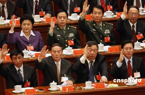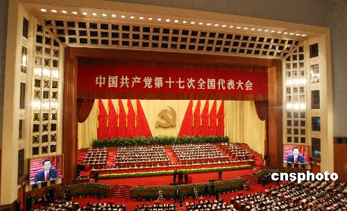 中國共產(chǎn)黨第十七次全國代表大會10月21日上午在北京人民大會堂閉幕。大會在選舉產(chǎn)生新一屆中央委員會和中央紀律檢查委員會后,以舉手表決的方式通過關于十六屆中央委員會報告的決議、關于中央紀律檢查委員會工作報告的決議、關于《中國共產(chǎn)黨章程(修正案)》的決議。中新社發(fā) 任晨鳴 攝