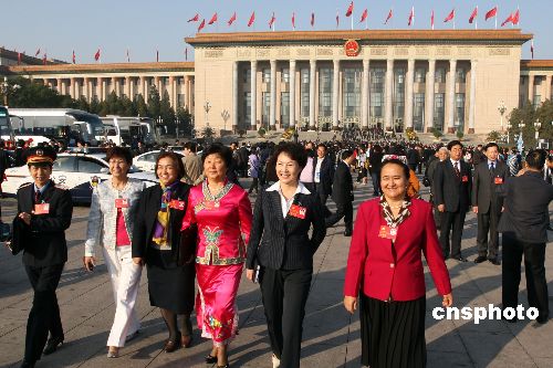 中國共產(chǎn)黨第十七次全國代表大會10月21日上午在北京人民大會堂閉幕,圖為新疆代表團(tuán)的各族代表走出會場。中新社發(fā) 任晨鳴 攝