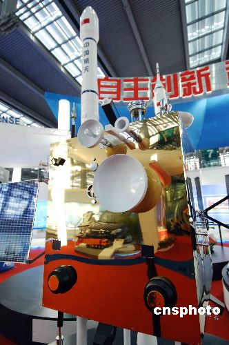 第九屆中國(guó)國(guó)際高新技術(shù)成果交易會(huì)十月十一日晚開幕,嫦娥一號(hào)月球探測(cè)衛(wèi)星亮相深圳第九屆高交會(huì)。中新社發(fā) 陳文 攝