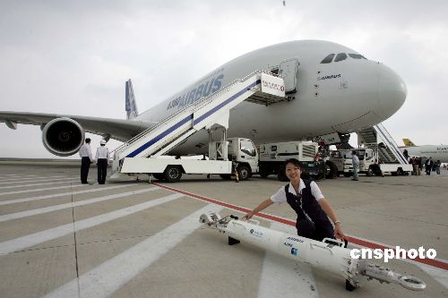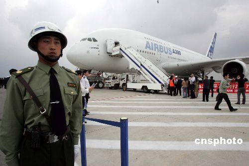 十月二十五日,空中客車A380飛機(jī)在上海浦東國(guó)際機(jī)場(chǎng)展示,據(jù)悉,這架生產(chǎn)序列號(hào)為007的A380是首度在上海公開(kāi)其豪華客艙內(nèi)飾。空客工作人員在此間表示,A380目前獲得十六家客戶的一百八十九架確認(rèn)及承諾訂單,○八年將交付十三架,○九年交付二十五架,到二○一○年,將年產(chǎn)四十架,而中國(guó)南方航空訂購(gòu)的五架A380計(jì)劃在○九年下半年交付。中新社發(fā) 潘索菲 攝