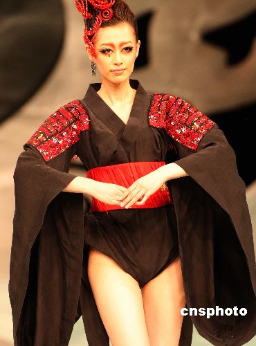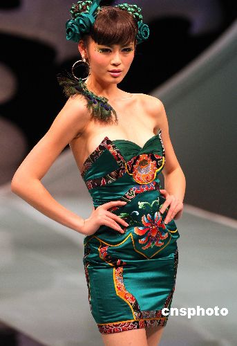 11月3日晚,在北京中國國際時裝周上著名時裝品牌NE·TIGER推出“錦繡國色華夏禮服”NE·TIGER2008高級華服發(fā)布會,設計師張志峰在禮服色彩搭配以及款式風格上大膽創(chuàng)新,以中華傳統(tǒng)民族文化為底蘊,融合現代時裝多元素風格突出作品自然質樸又呈現出高貴而莊重的氣質。圖為模特展示該品牌推出的最新設計作品。中新社發(fā) 錢興強 攝