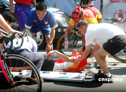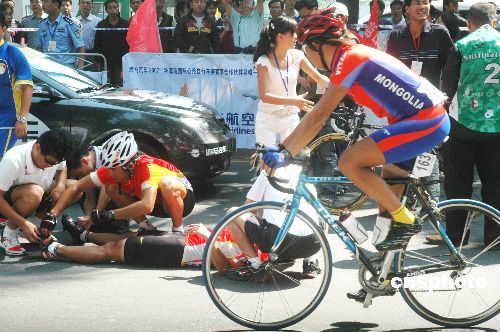 2007年11月6日,“海馬汽車(chē)杯”環(huán)海南島國(guó)際公路自行車(chē)賽進(jìn)入第三賽段文昌——?诒荣。各國(guó)選手在歷經(jīng)總里程125公里后,快速?zèng)_刺設(shè)在?谑袨I海大道的終點(diǎn)站時(shí),一名在劃線內(nèi)的記者突然探頭出來(lái)?yè)屌恼掌,結(jié)果被撞頭破血流,相機(jī)摔破,而兩名選手人仰馬翻摔成重傷,另一選手被擦輕傷,當(dāng)時(shí)的驚險(xiǎn)場(chǎng)面引起觀賽者一片驚呼聲。中新社發(fā) 善平 攝