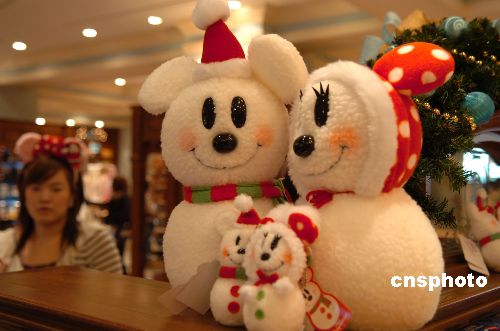 圖為東京迪斯尼樂園中的特色禮物商店中的圣誕吉祥物“雪人一家”。