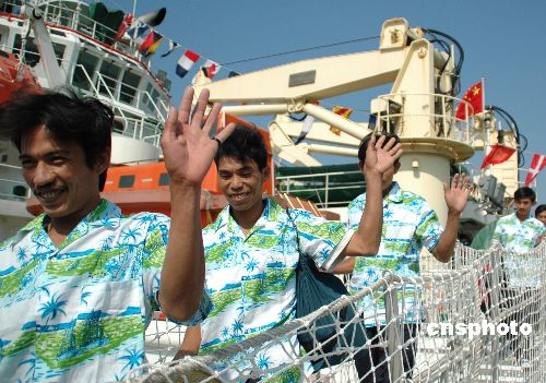 十一月三十日,中國“南海救一一二”和“南海一九九”兩艘救護船載著十名因受臺風“海貝思”影響而被困南沙、西沙的中越漁民返回海南三亞,其中越南漁民七人,中國漁民三人。中新社發(fā) 尹海明 攝