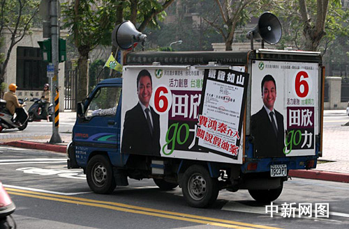 立委”候選人笑容可掬,但批評起競選對手來,那是該怎么的就怎么的。圖為一月十日上午行使駛在臺北街頭的一輛競選文宣車。作者:陳立宇