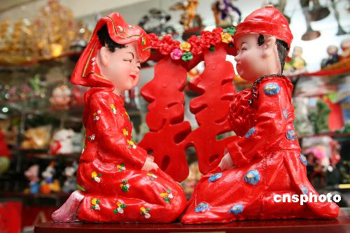 2月13日,河南許昌某商店拍攝的具有民俗特色的“情侶”飾品。情人節(jié)前夕,許昌一些商家推出造型別致的“情侶”飾品,既符合“情人節(jié)”浪漫情調(diào)又具有民俗特色,深受人們喜愛。中新社發(fā) 牛書培 攝