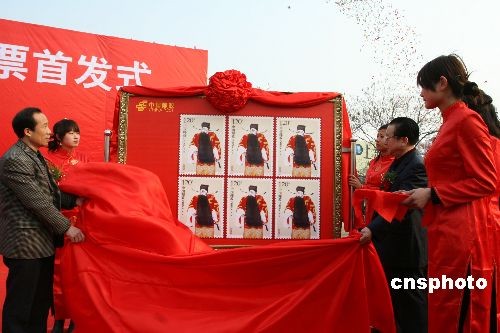 2月23日,《京劇凈角》曹操特種郵票在河南許昌首發(fā)!毒﹦艚恰诽胤N郵票一套6枚,為徐彥昭、包拯、廉頗、張飛、曹操、楊延嗣6位人物的京劇傳統(tǒng)劇目典型形象,此套郵票是繼《京劇生角》、《京劇旦角》、《京劇丑角》特種郵票之后發(fā)行的最后一套京劇題材類郵票。這套郵票的發(fā)行,將對(duì)弘揚(yáng)傳統(tǒng)文化、振興京劇藝術(shù)起到推動(dòng)作用。 中新社發(fā) 牛書培 攝