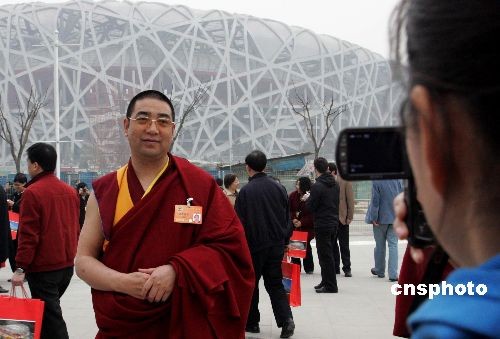 三月十二日下午,部分全國政協(xié)委員參觀北京奧運(yùn)場館。圖為全國政協(xié)委員、青海省佛教協(xié)會(huì)副會(huì)長拉茂賽赤活佛,在北京奧運(yùn)會(huì)國家體育場“鳥巢”前請人拍照留影。中新社發(fā) 潘索菲 攝