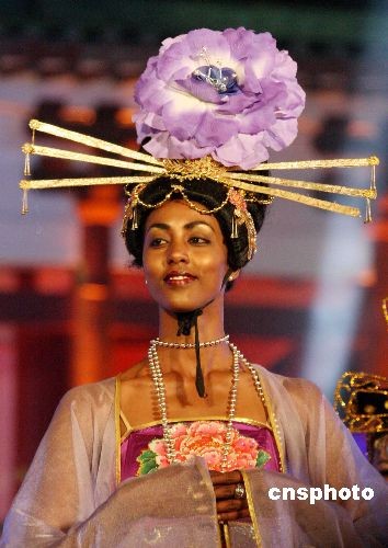 4月1日晚,2008國際旅游小姐總決賽“迪斯科皇后”單項決賽晚會在河南洛陽舉行。來自世界115個國家的115位佳麗參賽,在晚會現場4位不同膚色的佳麗當場“秀”起了中國傳統(tǒng)服飾--唐裝。中新社發(fā) 曾憲平 攝