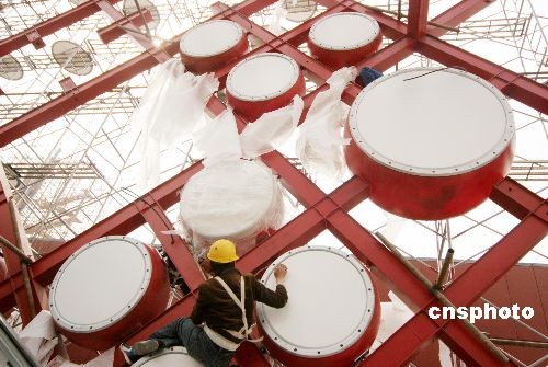 4月5日,北京奧林匹克中心區(qū)下沉花園,施工人員正在加緊往桔紅色框架上安裝大鼓,迎接2008北京奧運會。據(jù)悉,這些大鼓的直徑在1米至兩米左右, 屆時,數(shù)百個大鼓將組成一道富有中國特色的靚麗風景。中新社發(fā) 吳芒子 攝