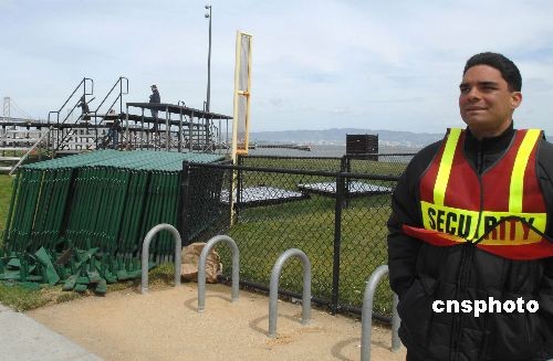 當(dāng)?shù)貢r(shí)間四月八日,一名保安人員在舊金山中國灣公園執(zhí)勤。北京奧運(yùn)火炬舊金山站傳遞活動(dòng)開幕儀式九日將在這里舉行,開幕式所用舞臺基本搭建完成。作者: 張煒