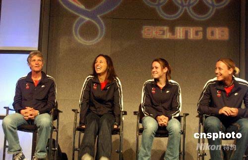 4月14日,兩次奪得奧運金牌的美國女子足球隊主要成員在芝加哥美國奧運代表團新聞峰會上表示,北京奧運會的主要目標是奪冠。圖為去年年底剛上任的美國女足主教練皮亞(左一),前鋒凱特·馬克格拉芙(左二),后衛(wèi)奧雷利(右二)、前鋒阿比·邁巴赫(右一)。 作者: 李靜