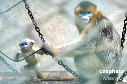 4月16日,鄭州動物園的一只金絲猴(母猴)攜剛滿月的猴仔“美美”同游客見面,由于今年是奧運年,工作人員稱之為“奧運猴寶寶”。據(jù)介紹,金絲猴屬中國一級野生動物,每年一胎,加之繁殖成活率較低,顯得尤為珍貴。 中新社發(fā) 李志全 攝