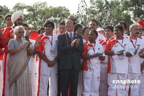 4月17日下午,北京奧運圣火傳遞活動在新德里印度總統(tǒng)府和印度門之間的拉吉大街上進(jìn)行。70名火炬手沿著這條三公里長的大街傳遞圣火。圖為北京奧組委執(zhí)行副主席蔣效愚出席北京奧運圣火新德里傳遞起跑儀式。作者: 沈晨