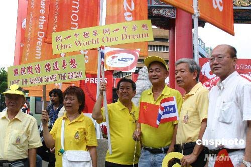 4月19日下午3時15分,祖籍中國海南的泰國第二代華裔阿南·詩里帕差臘蓬從曼谷市市長阿皮拉手中接過“祥云”火炬,北京奧運圣火在此間的傳遞正式開始。北京奧運圣火在曼谷的傳遞約10.8公里,共有80名火炬手,其中泰籍華人占一半以上;鹁孀蕴迫私种腥A門出發(fā)后,途經(jīng)臥佛寺、大王宮、民主紀念碑、集拉達王宮、阿南達王宮等曼谷著名景點后,最終在五世王銅像廣場舉行慶典儀式。圖為華人華僑在圣火傳遞沿途舉牌助威。 中新社發(fā) 沈晨 攝