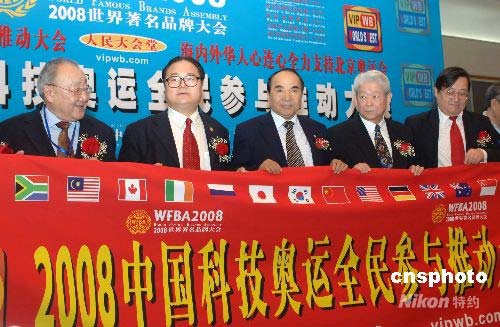 2008年4月20日,為了表達海內外華人心連心全力支持北京奧運會的共同心愿,發(fā)揚科技奧運全民參與精神、提高科技奧運全民參與意識,由世界著名品牌大會主辦機構美中經貿投資總商會、世界品牌組織、全美在線文化傳媒等華商機構聯(lián)合主辦的“2008中國科技奧運全民參與推動大會”,在北京人民大會堂隆重舉行,全國政協(xié)副主席阿不來提·阿不都熱西提(左三)出席大會。圖為阿不來提與美中經貿投資總商會會長、世界著名品牌大會主席周茳釤鈞(左二)及領導人與嘉賓共同舉行“2008中國科技奧運全民參與推動大會”推動儀式。周茳釤鈞呼吁:海內外華人團結起來,為北京奧運會的成功舉辦獻計獻策,發(fā)揮優(yōu)勢,奉獻力量。 作者: 鄒憲