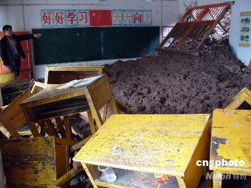 4月21日,湖北省興山縣小河村甘家坡特大山體滑坡現(xiàn)場(chǎng)。4月18日上午至20日凌晨,湖北興山縣出現(xiàn)持續(xù)暴雨天氣,最高降雨量達(dá)106毫米。19日下午5時(shí)30分,興山縣高陽(yáng)鎮(zhèn)小河村甘家坡開始發(fā)生特大山體滑坡,截至20日10時(shí),滑坡體體積達(dá)6萬立方米,形成2萬立方米泥石流。該滑坡體位于高陽(yáng)鎮(zhèn)中心小學(xué)背后,泥石流沖垮學(xué)校后圍墻40米,推倒學(xué)生食堂1棟3間,涌入了1樓教室并蔓延至操場(chǎng)。幸虧事發(fā)時(shí)學(xué)生逢周末放假不在校,否則可能會(huì)導(dǎo)致群死群傷的災(zāi)難性后果。目前,又有2萬立方米滑坡體已經(jīng)變形,存在繼續(xù)下滑的可能,受特大滑坡及泥石流險(xiǎn)情直接危及的高陽(yáng)鎮(zhèn)中心小學(xué)已從21日起停課,甘家坡周邊37戶179人已撤出現(xiàn)場(chǎng)。中新社發(fā) 劉君鳳 攝