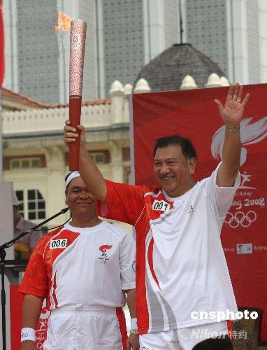圖為第一棒火炬手、馬來西亞奧委會(huì)主席東姑伊姆拉展示“祥云”火炬。作者: 沈晨