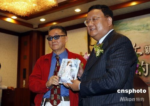 圖為李敖向鳳凰衛(wèi)視總裁劉長(zhǎng)樂(lè)贈(zèng)書。中新社發(fā) 杜洋 攝