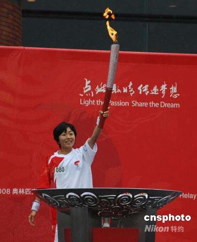 4月26日中午12時(shí)17分,北京奧運(yùn)圣火長(zhǎng)野傳遞活動(dòng)中的最后一位火炬手--雅典奧運(yùn)會(huì)女子馬拉松冠軍野口MIZUKI在展示火炬后點(diǎn)燃圣火盆。中新社發(fā) 關(guān)妍 攝