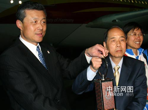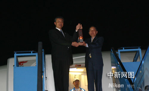4月28日凌晨0時20分,載有北京奧運圣火的“奧運圣火號”平穩(wěn)地降落在平壤國際機場。朝鮮首都平壤是北京奧運圣火海外傳遞“和諧之旅”的第18站。這是奧運圣火自一九三六年開始傳遞活動以來,首次來到朝鮮。圖為北京奧組委執(zhí)行副主席李炳華(左二)與中國駐朝鮮大使劉曉明(左)共舉圣火燈。沈晨 攝