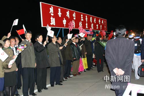 4月28日凌晨0時(shí)20分,載有北京奧運(yùn)圣火的“奧運(yùn)圣火號”平穩(wěn)地降落在平壤國際機(jī)場。朝鮮首都平壤是北京奧運(yùn)圣火海外傳遞“和諧之旅”的第18站。這是奧運(yùn)圣火自一九三六年開始傳遞活動(dòng)以來,首次來到朝鮮。圖為朝鮮民眾在平壤國際機(jī)場迎接奧運(yùn)圣火到來。沈晨 攝