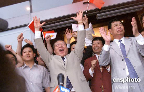 2001年7月13日,在莫斯科世界貿(mào)易中心舉行的國際奧委會(huì)112次會(huì)議中,北京獲得2008年奧運(yùn)會(huì)舉辦權(quán),代表團(tuán)成員們歡慶勝利。中新社發(fā) 王瑤 攝