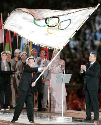 2004年8月29日,北京市長(zhǎng)王岐山在雅典奧運(yùn)會(huì)閉幕式上,從國(guó)際奧委會(huì)主席羅格手中接過(guò)奧運(yùn)會(huì)會(huì)旗。