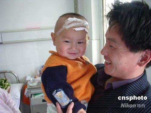 4月29日,阜陽市第二人民醫(yī)院,家長抱著已脫離生命危險(xiǎn)的患兒在病房內(nèi)笑逐顏開。家住安徽省阜陽市潁泉區(qū)蘇屯鄉(xiāng)孟寨大隊(duì)1歲患兒劉暢,4月17日因發(fā)熱伴手足皮疹入住該醫(yī)院,當(dāng)時(shí)病情很嚴(yán)重,經(jīng)醫(yī)院專家會(huì)診調(diào)整治療方案,目前病情穩(wěn)定。4月29日上午,安徽省衛(wèi)生廳副廳長杜昌智在通報(bào)會(huì)上說,目前阜陽共報(bào)告腸道病毒EV71感染病例1520例,其中痊愈585例,經(jīng)全力搶救無效死亡20例,仍在住院治療412例,其中重癥患者26例。中新社發(fā) 張婭子 攝